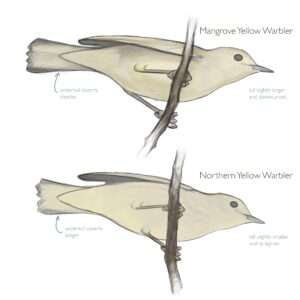 Differences in content: The text for many species is changed slightly between the three books. Mostly this reflects regional differences in status or other features, but in some cases text was also rewritten to reflect different identification challenges in each region. Some text simply wouldn’t fit in the smaller books and was cut (for example, voice descriptions are shortened), and the sidebar essays on various topics are slightly different among the three books. The revised Eastern and Western field guides were published two years later than the big guide, and include several species of introduced exotic birds that are not included in the big guide. These are primarily found in southern California and Florida: Pin-tailed Whydah, Bronze Mannikin, Orange-cheeked Waxbill, and Cinnamon-rumped Seedeater, and Japanese White-eye.