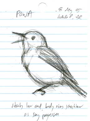 Part 5 of my introduction to learning bird songs is now up (click here).Many of the words that we use to describe the quality of a bird song also carry information about pitch and tempo. For example, only sounds in a certain pitch range can be described as whistled, and we tend to call lower-pitched whistles “rich” or “full”, and higher-pitched whistles ”thin” or “squeaky”. Similarly, certain descriptive words tell us about the tempo of the song. Words like relaxed and lethargic describe a slow tempo, and a buzz is just like a trill, only faster. |