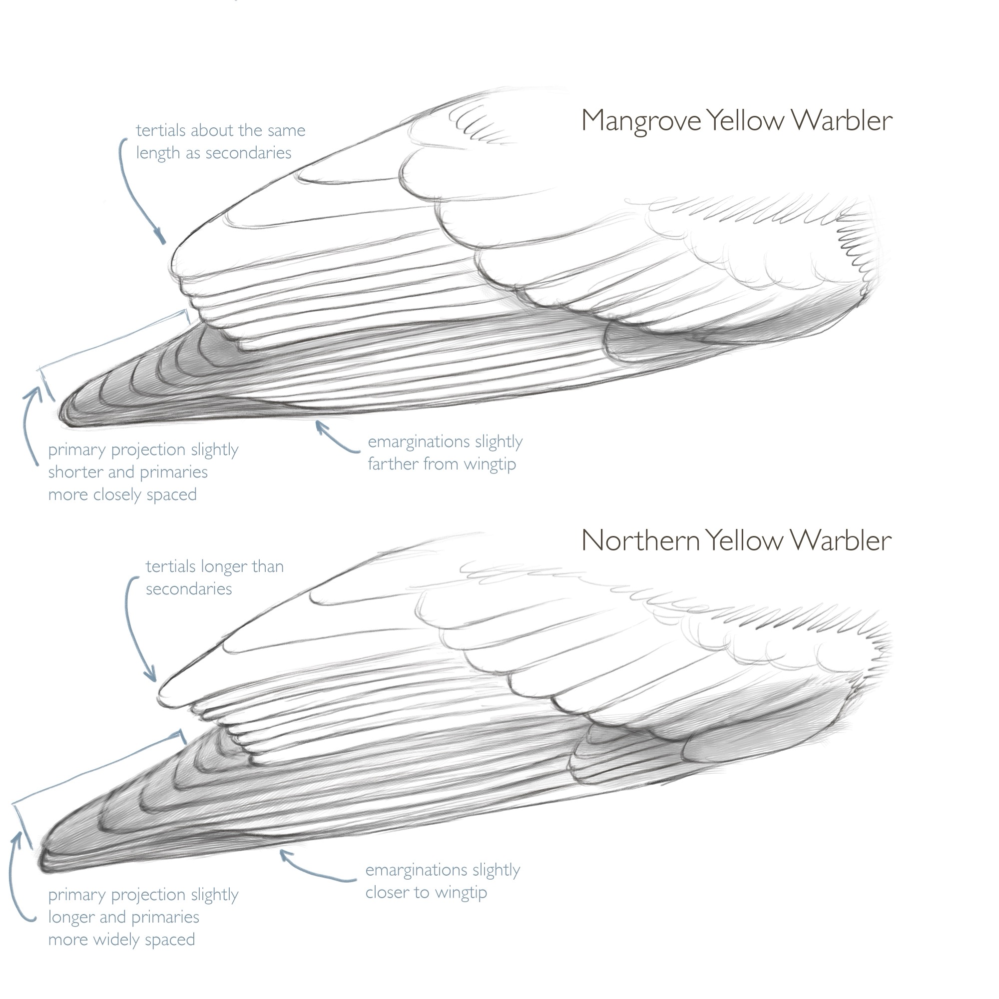 Differences in structure are mostly related to the migratory behavior of the two species. Northern Yellow Warbler is highly migratory, with some populations nesting near the Arctic Circle and wintering in South America, and it has evolved long, narrow wings and a more streamlined body shape for efficient long-distance flight. Mangrove Yellow Warbler is resident in its tropical mangrove habitat, with shorter and more rounded wings and less streamlined body, adapted for short flights.