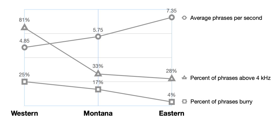 I also measured a few variables in these spectrograms and created a chart. I chose three variables that are relatively easy to measure, and that capture some of the key differences that I hear in the songs. As expected it shows the rate of phrases-per-second higher in the east, while high-pitched phrases and burry phrases are more frequent in the west. The Montana recordings are intermediate in all three measurements. This is a subjective and informal estimate with a very small sample size, but it matches my impression of many recordings from the contact zone.