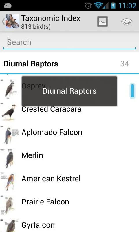 Find any species in seconds by typing a few letters of its name, or by scrolling through the list (either alphabetically or taxonomically)